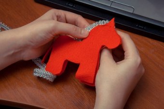 Для этого ленту помещаем между деталями и пришиваем швом «вперед иголку». Этим швом прошивается верх лошади от носа до хвоста.